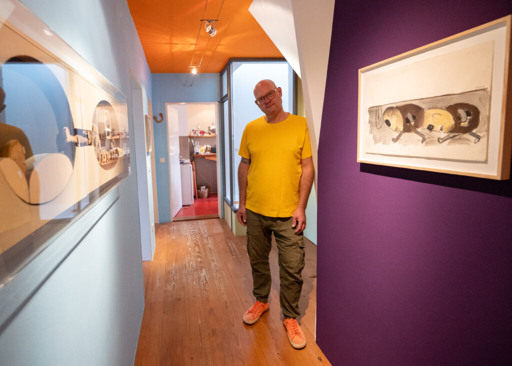 Wie viele gute Ideen entstand auch diese eher zufällig. Vor gut einem Jahrzehnt hatte sich Ralf Becker in seiner Vier-Zimmer-Dachgeschoss-Wohnung selbst einen kleinen separaten Raum im Flur gezimmert. Eine gläserne Kammer oder überdimensionierte Vitrine, raumhoch, eineinhalb Quadratmeter groß, außen Metallrahmen, innen beleuchtet. Sie sollte eigentlich nur zur Präsentation künstlerischer Neuerwerbungen dienen. Doch befreundete Künstler*innen schlugen vor, dort doch einmal eine kleine Ausstellung zu machen. Gesagt, getan: Premiere war 2013; mit viel positiver Resonanz. Seitdem organisiert Becker zweimal jährlich Kunstschauen, die gläserne Kammer als Blickfang – immer neu und individuell gestaltet.